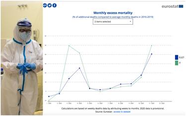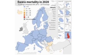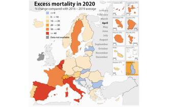 L'Ufficio statistico europeo ha messo a confronto il numero di decessi nell'anno appena passato con la media di quelli avvenuti negli anni 2016-2019. Il nostro Paese ha raggiunto i suoi livelli massimi di eccesso di mortalità in marzo (più 49,4%), aprile (41%) e novembre (49,5%)