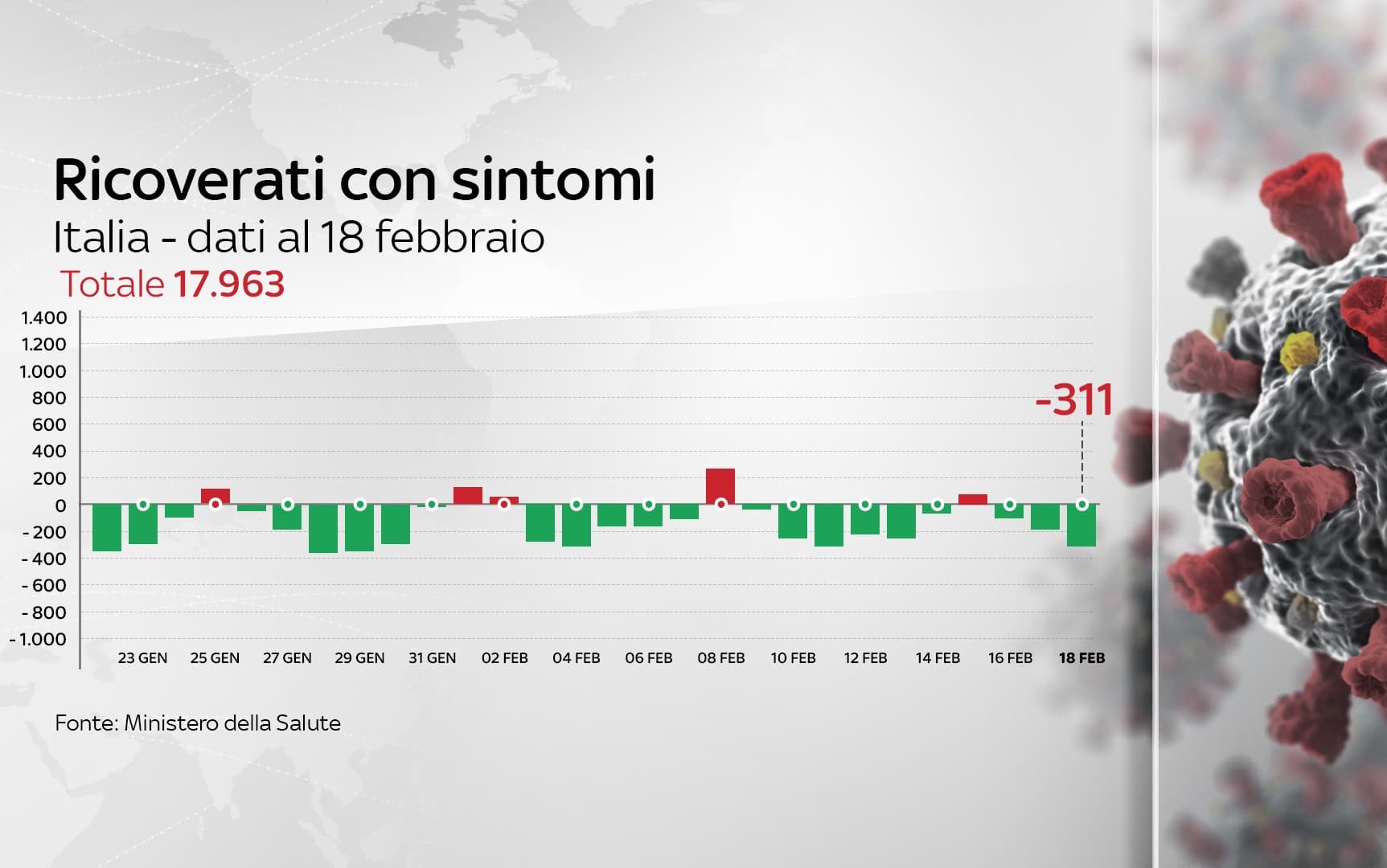 In Italia, dall'inizio della pandemia, le persone risultate positive al coronavirus, compresi guariti e deceduti, sono 2.765.412. Le vittime in totale sono 94.887, con 347 decessi nelle ultime 24 ore. I guariti, sempre nelle ultime 24 ore, sono 17.771, per un totale di 2.286.024. I ricoverati con sintomi sono 17.963 (-311). Sono invece 364.493 le persone in isolamento domiciliare. I tamponi sono in tutto 37.204.747 - di cui 33.274.904 processati con test molecolare e 3.929.843 con test antigenico rapido -, in aumento di 288.458 rispetto al 17 febbraio. I casi testati sono finora 18.645.837, al netto di quanti tamponi abbiano fatto.