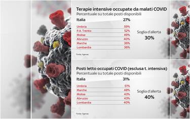 In Italia la percentuale di posti letto in terapia intensiva occupati da malati Covid rispetto a quelli disponibili è al 27%. La soglia d’allerta è fissata al 30%. Sei regioni superano questa soglia: Umbria, Provincia autonoma di Trento, Molise, Abruzzo, Marche e Lombardia