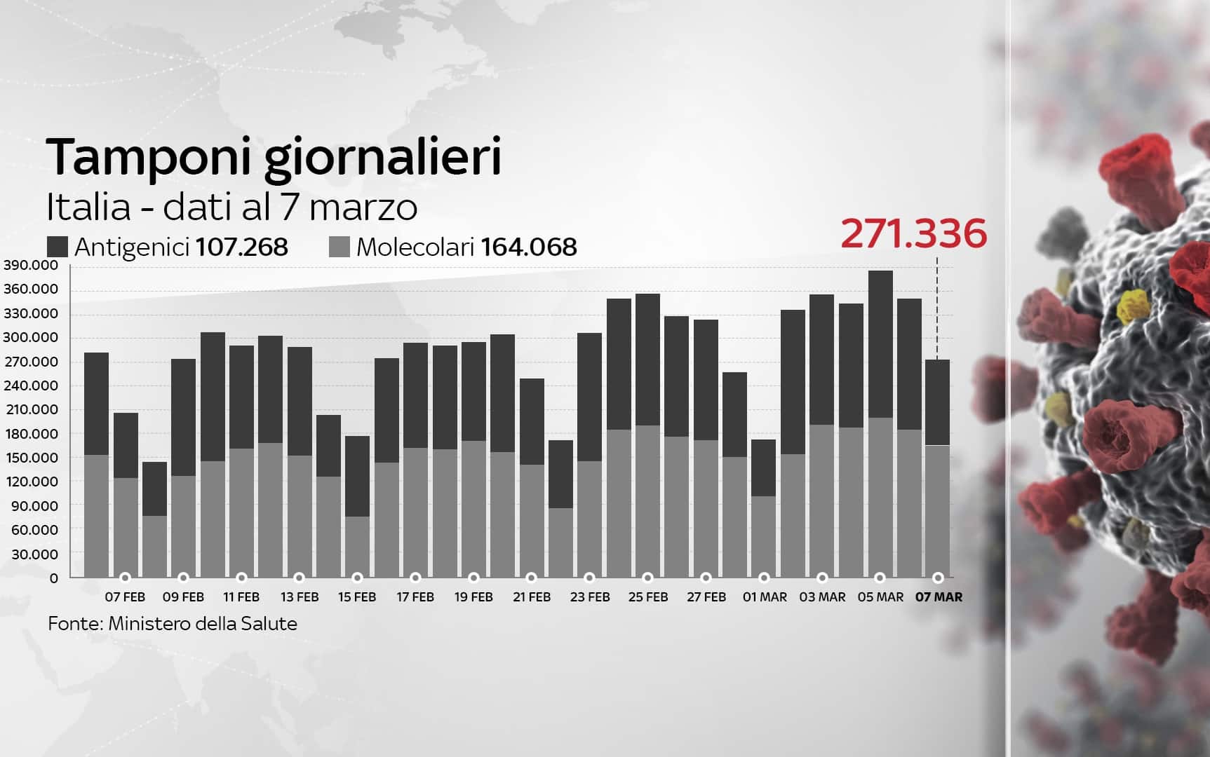 In Italia, dall'inizio della pandemia, le persone risultate positive al coronavirus, compresi guariti e deceduti, sono 3.067.486. Le vittime in totale sono 99.785, con 207 decessi nelle ultime 24 ore. I guariti sono un totale di 2.494.839. I ricoverati con sintomi sono 21.144 (+443). Sono invece 449.113 le persone in isolamento domiciliare. I tamponi sono in tutto 42.342.845 - di cui 36.013.136 processati con test molecolare e 6.329.709 con test antigenico rapido -, in aumento di 271.336 rispetto al 6 marzo. I casi testati sono finora 20.375.964, al netto di quanti tamponi abbiano fatto.