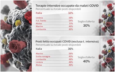 Escluse le terapie intensive, in Italia la percentuale di posti letto occupati negli altri reparti è del 36%. In questo caso la soglia d’allerta è fissata al 40%. Tra le regioni che superano questa soglia ci sono Marche, Emilia-Romagna, Lombardia, Umbria e Molise