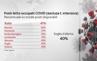 Escluse le terapie intensive, in Italia la percentuale di posti letto occupati negli altri reparti è del 41%. In questo caso la soglia d’allerta è fissata al 40%. Tra le regioni che superano questa soglia ci sono Marche, Piemonte, Emilia-Romagna, Lombardia, Abruzzo, Puglia e Umbria. In totale, le regioni sopra la soglia critica sono 9