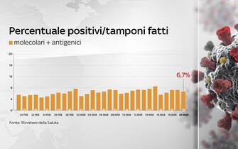 La percentuale di positivi - considerando il totale dei tamponi - è al 6,7% (ieri era al 7%)