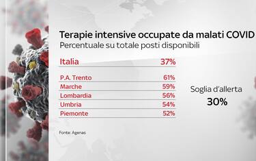 In Italia la percentuale di posti letto in terapia intensiva occupati da malati Covid rispetto a quelli disponibili è al 37%. La soglia d’allerta è fissata al 30%. Tra i territori che superano questa soglia ci sono Provincia autonoma di Trento, Marche, Lombardia, Umbria e Piemonte. In totale, superano la soglia critica le due province autonome più 11 regioni