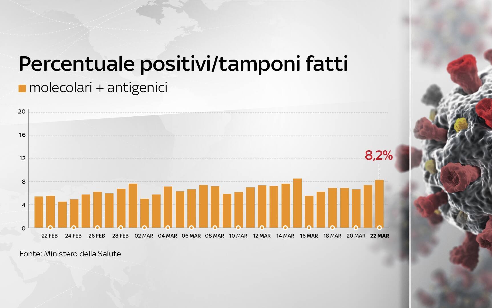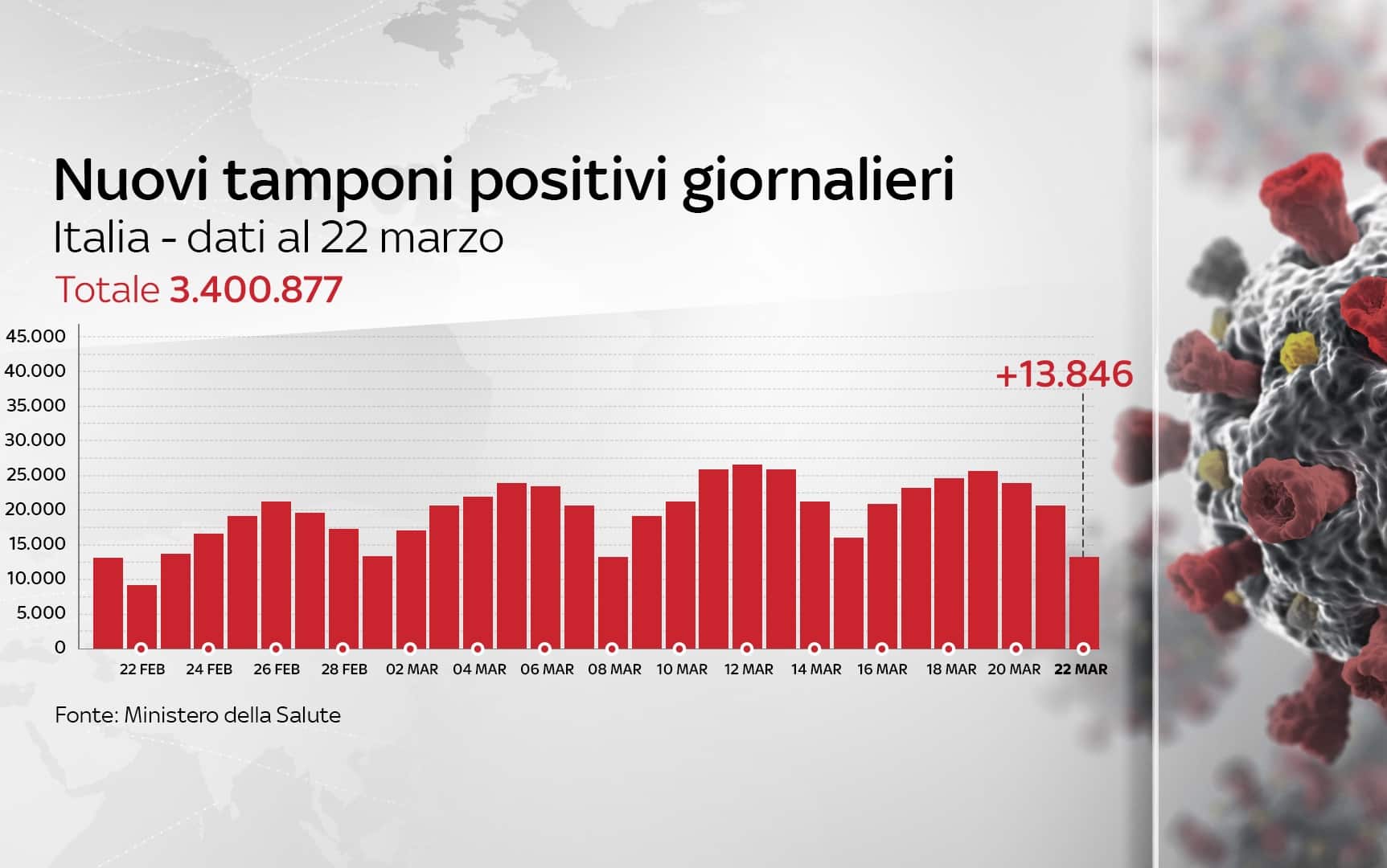 In Italia, dall'inizio della pandemia, le persone risultate positive al coronavirus, compresi guariti e deceduti, sono 3.400.877. Le vittime in totale sono 105.328, con 386 decessi nelle ultime 24 ore. I guariti sono un totale di 2.732.482. I ricoverati con sintomi sono 28.049 (+565). Sono invece 531.508 le persone in isolamento domiciliare. I tamponi sono in tutto 47.060.099 - di cui 38.660.491 processati con test molecolare e 8.399.608 con test antigenico rapido -, in aumento di 169.196 rispetto al 21 marzo. Le persone testate sono finora 22.071.115, al netto di quanti tamponi abbiano fatto.