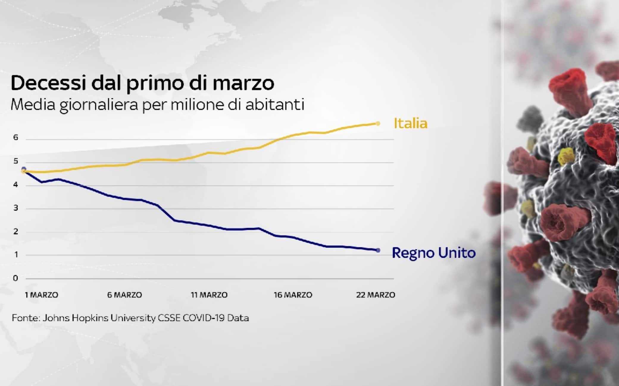 Da una parte una campagna vaccinale che prosegue spedita e il numero di vittime più basso da diversi mesi a questa parte, dall’altra le somministrazioni che vanno a rilento e la curva dei decessi che rimane drammaticamente alta. Messe a confronto, le curve che rappresentano la cifra più tragica della pandemia, quella delle vittime, in Italia e in Gran Bretagna mostrano una divergenza che sottolinea l’importanza di una campagna vaccinale quanto più rapida possibile. Ieri, 22 marzo, il Regno Unito ha registrato il numero più basso di decessi dallo scorso ottobre, 17. Il 23, invece, per l’Italia il record è stato purtroppo opposto: 551, un numero di morti che non si vedeva dal 19 gennaio (COVID, L’ANDAMENTO DEI CONTAGI IN ITALIA - AGGIORNAMENTI IN DIRETTA – LO SPECIALE).