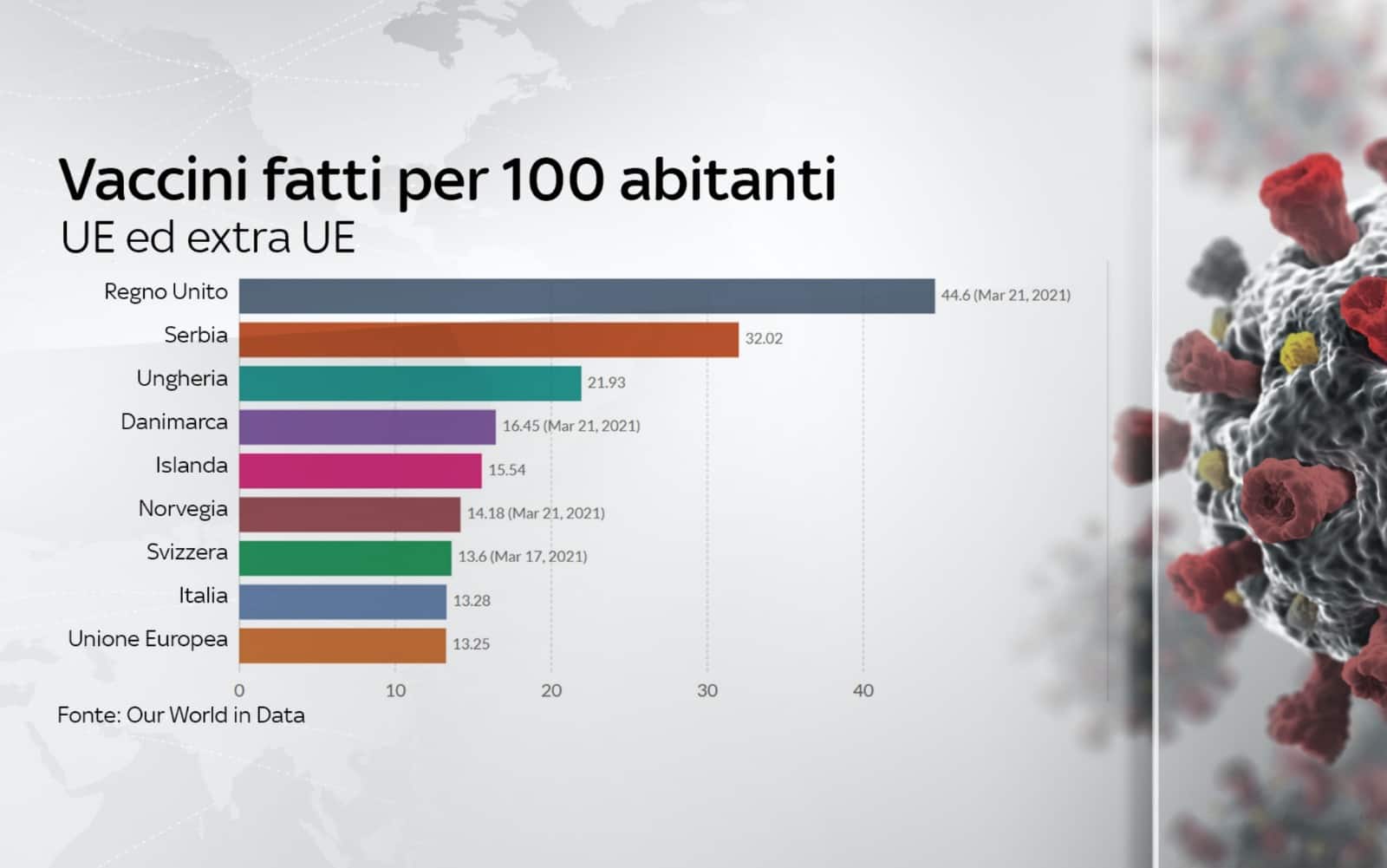 Anche al netto della peculiare scelta strategica di Londra (il governo britannico ha optato per una inoculazione della prima dose al più alto numero possibile di cittadini anche a costo di ritardare la somministrazione della seconda), nel Regno Unito la campagna vaccinale viaggia spedita, a ritmi dai quali i Paesi dell’Unione europea sono decisamente distanti, a causa dei noti problemi di approvvigionamento del vaccino. Nel Paese britannico il 42% della popolazione ha ricevuto almeno una dose del vaccino, contro soltanto il 9% dell’Italia. Un altro indicatore significativo è quello del numero di vaccini fatti per 100 abitanti, “classifica” nella quale il Regno Unito è saldamente in testa con 44,6, una cifra che è più del triplo di quella italiana (13,28), che è pienamente in linea con la media dei Paesi dell’Unione europea.