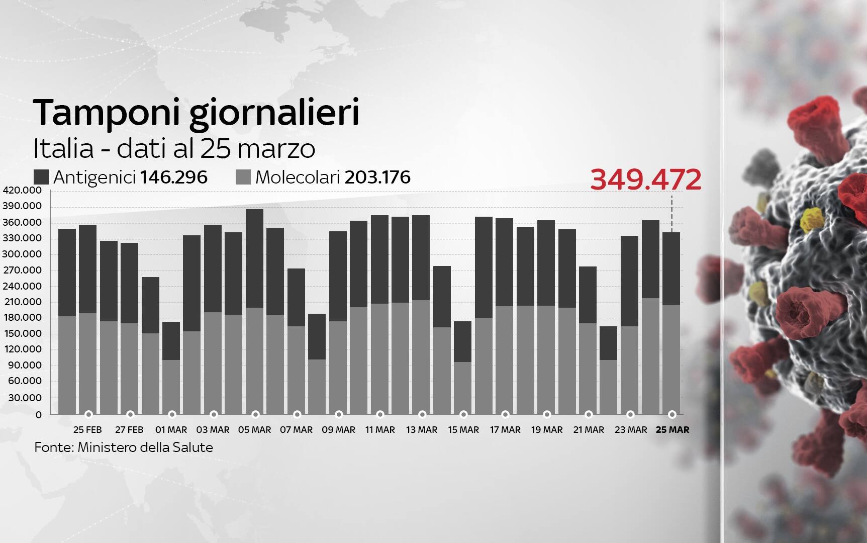 In Italia, dall'inizio della pandemia, le persone risultate positive al coronavirus, compresi guariti e deceduti, sono 3.464.543. Le vittime in totale sono 106.799, con 460 decessi nelle ultime 24 ore. I guariti sono un totale di 2.794.888. I ricoverati con sintomi sono 28.424 (-14). Sono invece 530.812 le persone in isolamento domiciliare. I tamponi sono in tutto 48.108.527 - di cui 39.251.933 processati con test molecolare e 8.856.594 con test antigenico rapido -, in aumento di 349.472 rispetto al 24 marzo. Le persone testate sono finora 22.405.643, al netto di quanti tamponi abbiano fatto.