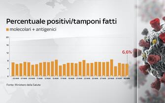 Stabile la percentuale dei positivi sui tamponi giornalieri effettuati: il dato è al 6,6% (6,64% il giorno precedente)