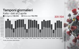 I nuovi casi sono stati rilevati su 331.154 tamponi giornalieri, compresi i test rapidi antigenici