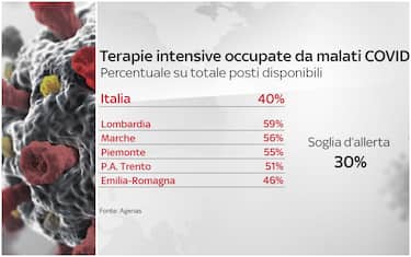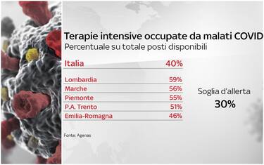 Continuano a calare i malati covid ricoverati in terapia intensiva: sono 3.603 (-60). A livello nazionale, tuttavia, la percentuale di posti occupati in rianimazione da malati covid è del 40% e rimane quindi sopra la soglia d'allerta fissata al 30%. Fra le regioni che superano la soglia dall'allarme ci sono Lombardia, Marche, Piemonte, Provincia autonoma di Trento ed Emilia-Romagna