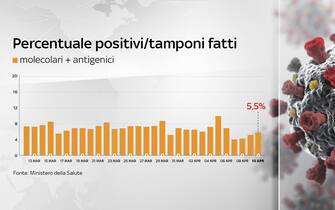 La percentuale di positivi - considerando il totale dei tamponi - è al 5,47% (era al 5,2)
