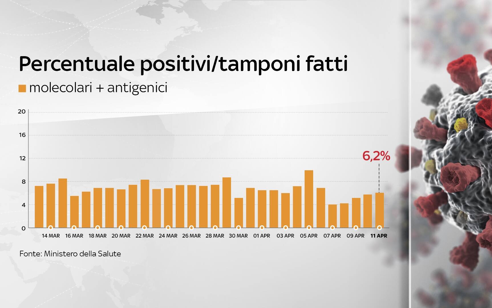Nelle ultime 24 ore sono stati 15.746 i nuovi casi di coronavirus registrati in Italia, mentre ieri erano stati 17.567. I tamponi effettuati sono 253.100, contro i 320.892 di ieri. La percentuale di positivi considerando il totale dei tamponi - quindi molecolari più antigenici rapidi - è al 6,2% (ieri era al 5,4%). Sono 331 i morti, 3 i pazienti in meno in terapia intensiva. È questo il quadro che emerge dal bollettino del ministero della Salute del 11 aprile (AGGIORNAMENTI LIVE - SPECIALE - LA SITUAZIONE IN ITALIA CON MAPPE E INFOGRAFICHE).