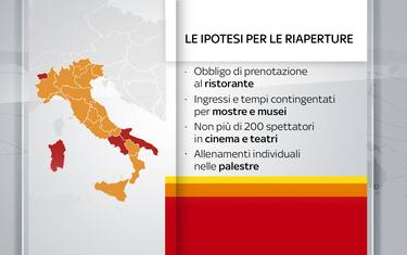 Non ci sarà quindi un liberi tutti e la maggior parte delle attività che sono chiuse dovrà attendere maggio. Nella grafica: le ipotesi in campo per il graduale rientro alla normalità di diverse attività in Italia