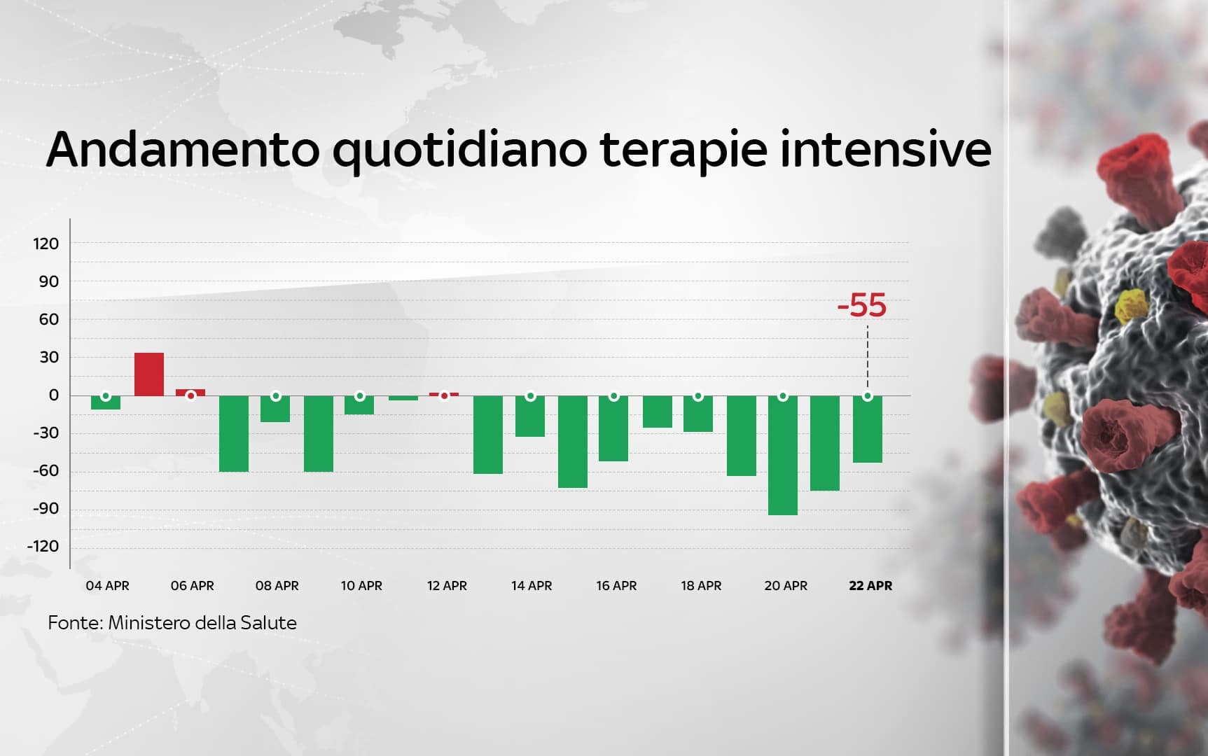 In Italia, dall'inizio della pandemia, le persone risultate positive al coronavirus, compresi guariti e deceduti, sono 3.920.945. Le vittime in totale sono 118.357, con 360 decessi nelle ultime 24 ore. I guariti sono un totale di 3.330.392. I ricoverati con sintomi sono 22.094 (-690). Sono invece 447.081 le persone in isolamento domiciliare. I tamponi sono in tutto 56.250.055 - di cui 43.862.164 processati con test molecolare e 12.387.891 con test antigenico rapido -, in aumento di 364.804 rispetto al 21 aprile. Le persone testate sono finora 24.905.379, al netto di quanti tamponi abbiano fatto.