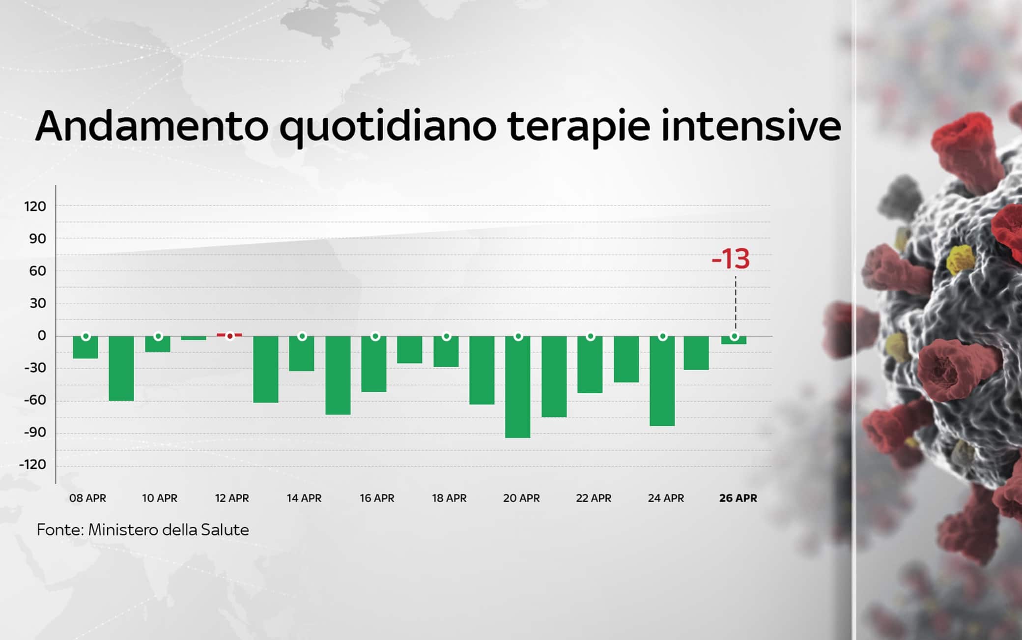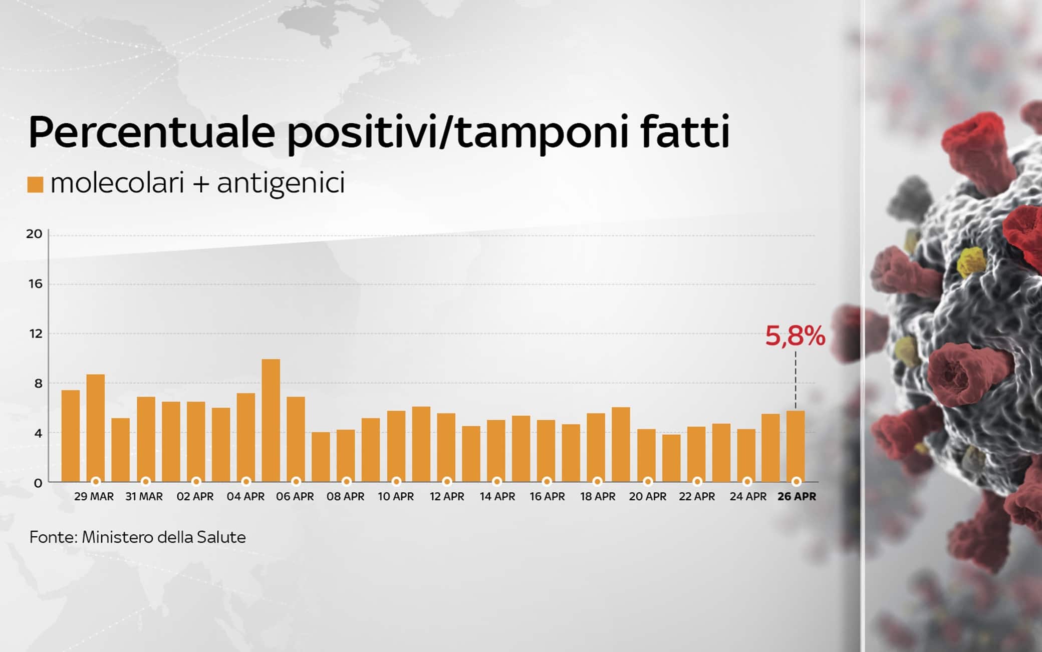 Sono 8.444 i nuovi contagi di Covid-19 in Italia (ieri 13.158), a fronte di 145.819 tamponi giornalieri effettuati (ieri 239.482). La percentuale di positivi considerando il totale dei tamponi è al 5,8% (ieri 5,5%). Sono 301 le vittime registrate in 24 ore. Le terapie intensive sono 2.849 (-13), con 132 nuovi ingressi in un giorno. È questo il quadro che emerge dal bollettino del ministero della Salute del 26 aprile sulla situazione coronavirus in Italia (AGGIORNAMENTI LIVE - SPECIALE - LA SITUAZIONE IN ITALIA CON MAPPE E INFOGRAFICHE).