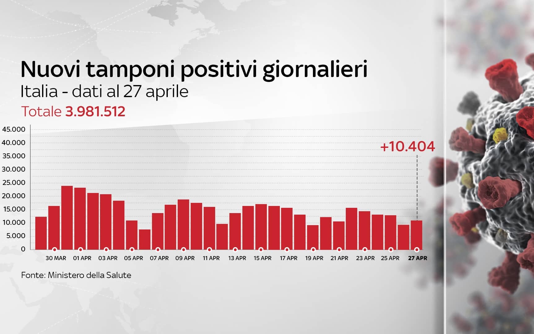 In Italia, dall'inizio della pandemia, le persone risultate positive al coronavirus, compresi guariti e deceduti, sono 3.981.512. Le vittime in totale sono 119.912, con 373 decessi nelle ultime 24 ore. I guariti sono un totale di 3.413.451. I ricoverati con sintomi sono 20.312 (-323). Sono invece 425.089 le persone in isolamento domiciliare. I tamponi sono in tutto 57.574.570 - di cui 44.602.172 processati con test molecolare e 12.972.398 con test antigenico rapido -, in aumento di 302.734 rispetto al 26 aprile. Le persone testate sono finora 25.359.025, al netto di quanti tamponi abbiano fatto.