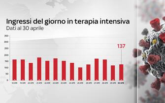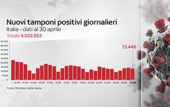 Secondo il bollettino del ministero della Salute del 30 aprile, diminuiscono i pazienti positivi ricoverati negli ospedali: in rianimazione ci sono 2.583 persone (-57, 137 gli ingressi del giorno) e negli altri reparti 18.940 (-411). Nelle ultime 24 ore sono stati 13.446 i nuovi casi di coronavirus, su 338.771 tamponi (ieri 14.320 casi su 330.075 test). La percentuale di positivi è al 3,97% (era al 4,3). Dall'inizio della pandemia, i casi totali sono 4.022.653 e le vittime 120.807 (+263)
