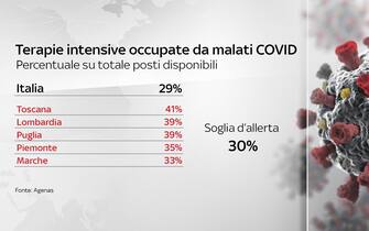 In Italia la percentuale di posti letto in terapia intensiva occupati da malati Covid rispetto a quelli disponibili è al 29%. La soglia d’allerta è fissata al 30%. Tra le regioni che superano questa soglia ci sono Toscana, Lombardia, Puglia, Piemonte e Marche