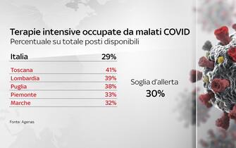 Scende, ma rimane alto, il numero di Regioni che hanno un tasso di occupazione in terapia intensiva e/o aree mediche sopra la soglia critica, 8 contro le 12 della settimana precedente. Secondo i dati Agenas, solo Calabria e Puglia superano la soglia d’allerta dei posti letto occupati nei reparti ordinari