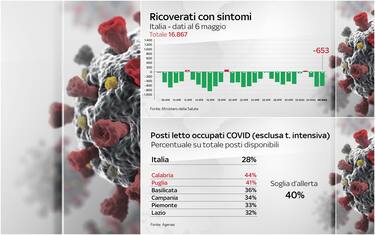 Nonostante il calo generale dei ricoveri, ci sono ancora regioni con ospedali sotto pressione. Escluse le terapie intensive, in Italia la percentuale di posti letto occupati negli altri reparti è del 28%. La soglia d’allerta è fissata al 40%. Le regioni che superano questa soglia sono Calabria e Puglia