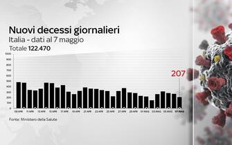 Le vittime registrate in 24 ore sono 207, in calo rispetto al giorno precedente (258). I morti dall’inizio della pandemia sono 122.470