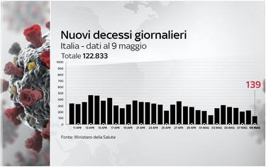 I morti giornalieri registrati dal bollettino del 9 maggio del ministero della Salute portano il totale a 122.833 dall’inizio della pandemia. I nuovi casi in 24 ore sono 8.292, rilevati su 226.006 tamponi giornalieri con una percentuale di positivi al 3,66% (ieri 3%). Continua il calo di terapie intensive e ricoveri ordinari