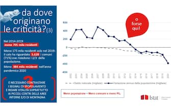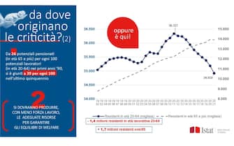 Un altro aspetto critico, evidenzia l'Istat, è il calo della popolazione residente. Tra il 2014 e il 2019 l'Italia ha perso 705mila residenti. L'istituto di statistica nel grafico mostra anche la discesa del numero di persone in età lavorativa (20-64 anni) nell'ultimo decennio