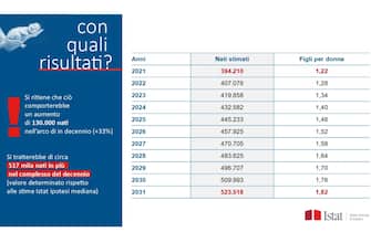 L'Istat pone un obiettivo definito "realistico" per il 2030: accrescere il numero medio di figli per donna di 0,60 in un decennio. Secondo l'istituto statistico questo dovrà compensare il calo del "potenziale riproduttivo" nei prossimi 10 anni