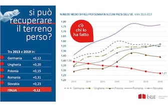 Dalla bassa natalità consegue che il numero medio di figli per donna in Italia (nel 2020 a 1,24) è diminuito (-0,12) tra il 2013 e il 2019, in un trend di costante decrescita negli ultimi anni, come mostra il grafico Istat (l'Italia è la linea in rosso). Altri Paesi sono riusciti invece a recuperare terreno