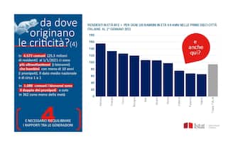 Un altro dato evidenzia il fenomeno dell'invecchiamento della popolazione in Italia: in 4.572 comuni (dove risiedono 25,5 milioni di persone) ci sono più ultraottantenni che bambini con meno di 10 anni. Il grafico dell'Istat mostra il numero di ultraottantenni ogni 100 bambini tra gli 0 e i 9 anni nelle principali città italiane