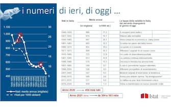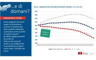 L'Istat parla di un "pesante crollo" negli ultimi 5 anni della natalità: si è passati, per esempio, dai 18 nati ogni 1000 abitanti della seconda metà degli anni '60, a 10 nella seconda metà degli anni '80, fino ai 7,3 del periodo 2016-2020. Nell'anno 2020 sono nati 404mila bambini, per il 2021 la stima è di un calo arrivando a una cifra tra i 384mila e i 393mila
