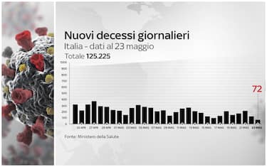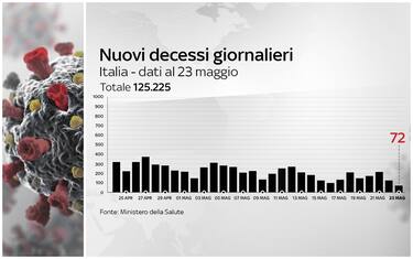 Le vittime in totale sono 125.225, con 72 decessi nelle ultime 24 ore (ieri 125). Si tratta del numero giornaliero più basso da inizio anno. E per la seconda volta a maggio si registrano meno di 100 vittime in 24 ore (furono 93 domenica scorsa). Sono dati che non si vedevano da sette mesi: lo scorso 20 ottobre si ebbero 89 vittime e da allora fino a maggio non si era mai scesi sotto i 100 decessi al giorno