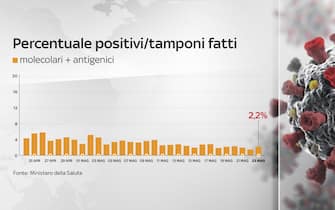 La percentuale di positivi considerando il totale dei tamponi è al 2,2% (ieri 1,6%)