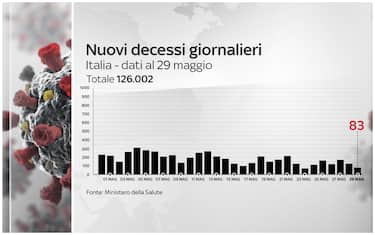 Secondo il bollettino del 29 maggio i decessi legati alla pandemia sono stati 83 in 24 ore. Domenica scorsa erano stati 72, il minimo registrato da inizio anno. In questo mese è la terza volta che questo dato scende sono quota 100. Intanto i nuovi casi sono 3.351 su 247.330 tamponi giornalieri effettuati. La percentuale dei positivi è all'1,4%