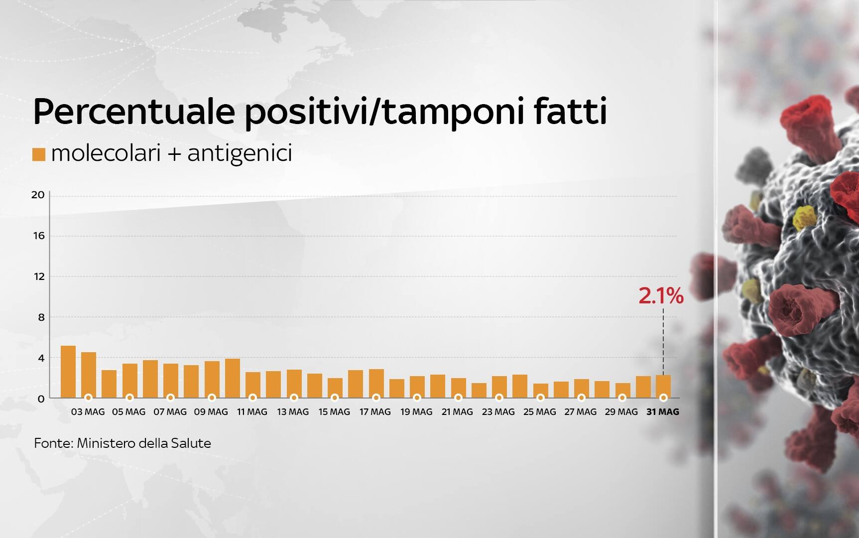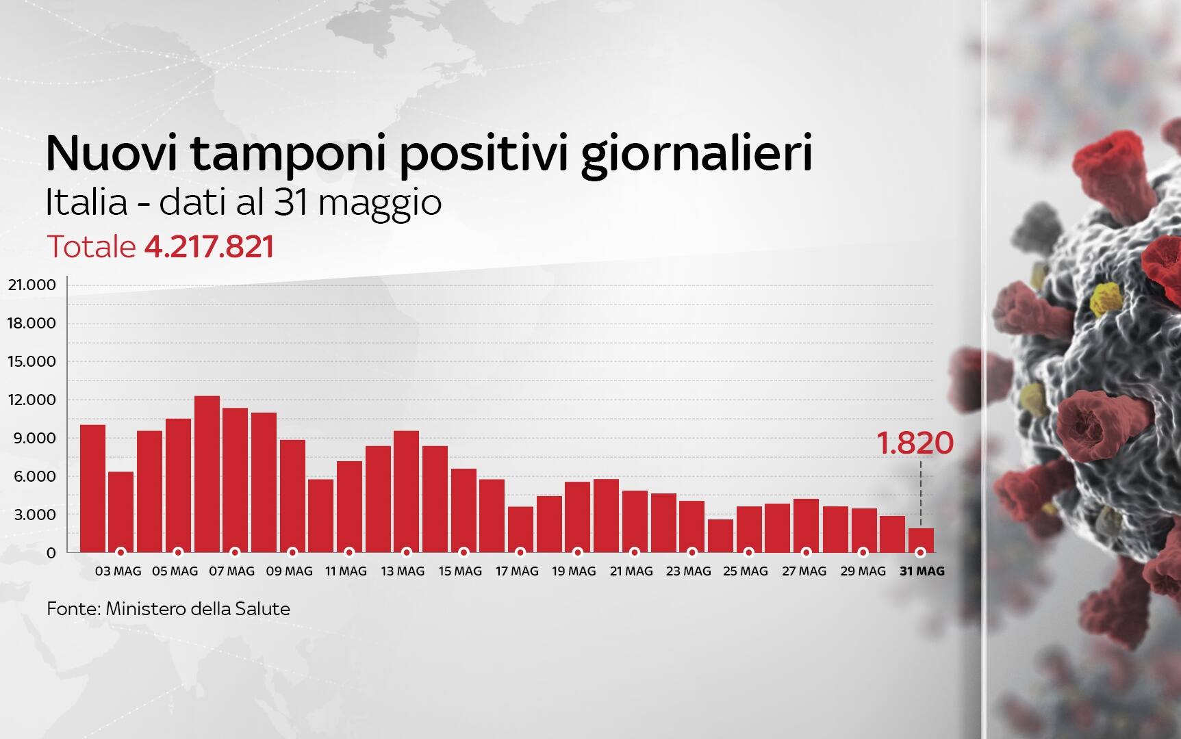 Sono 1.820 i nuovi contagi di Covid-19 in Italia (ieri 2.949), a fronte di 86.977 tamponi giornalieri effettuati (ieri 164.495). La percentuale di positivi considerando il totale dei tamponi è al 2,1% (ieri 1,8%). Sono 82 le vittime registrate in 24 ore. Le terapie intensive sono 1.033 (-28), con 38 nuovi ingressi nelle ultime 24 ore. È questo il quadro che emerge dal bollettino del ministero della Salute del 31 maggio sulla situazione coronavirus in Italia (AGGIORNAMENTI LIVE - SPECIALE - LA SITUAZIONE IN ITALIA CON MAPPE E INFOGRAFICHE - DATI E GRAFICI SUI VACCINI).