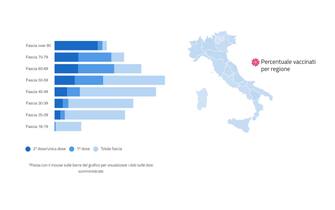 Circa un italiano su cinque ha completato il ciclo vaccinale contro il Covid-19, per un totale di 11.871.163 persone totalmente coperte. Le dosi somministrate sono quasi 34 milioni e mezzo, su 36.702.939 farmaci consegnati. La regione più virtuosa è l’Umbria. Se si guarda ai numeri assoluti, in testa per somministrazioni sono Lombardia, Lazio e Marche