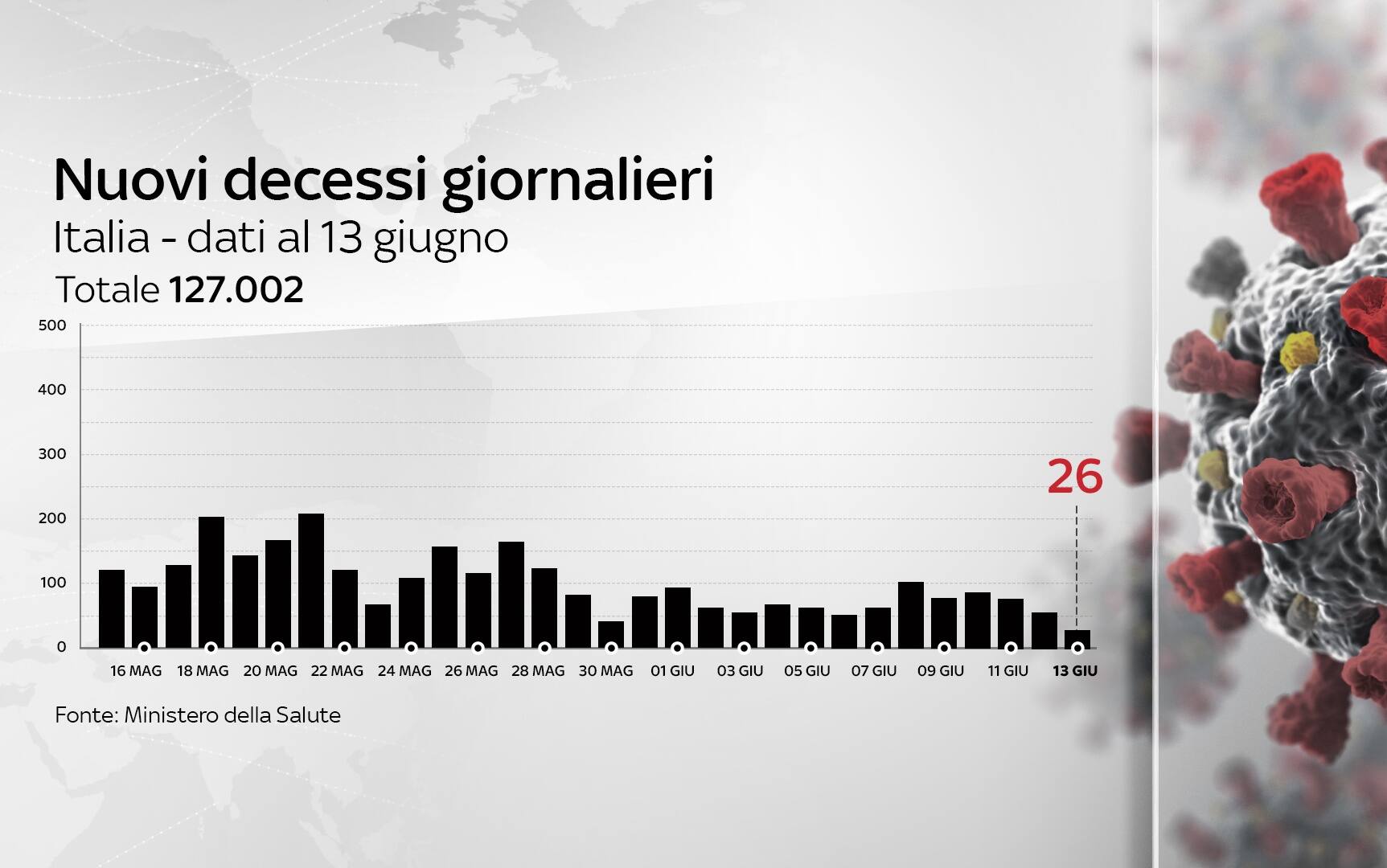 In Italia, dall'inizio della pandemia, le persone risultate positive al coronavirus, compresi guariti e deceduti, sono 4.244.872. Le vittime in totale sono 127.002, con 26 decessi nelle ultime 24 ore. I guariti sono un totale di 3.957.557. I ricoverati con sintomi sono 3.542 (-113). Sono invece 156.206 le persone in isolamento domiciliare. I tamponi sono in tutto 68.604.561 - di cui 50.510.527 processati con test molecolare e 18.094.034 con test antigenico rapido -, in aumento di 134.136 rispetto al 12 giugno. Le persone testate sono finora 28.817.395, al netto di quanti tamponi abbiano fatto.