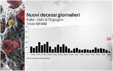 Sono 26 le persone positive al Covid-19 morte nelle ultime 24 ore in Italia, secondo il bollettino del ministero della salute del 13 giugno. Non si registrava un numero di decessi così basso dallo scorso 11 ottobre (quando le vittime furono 26 proprio come oggi). Ieri i decessi erano stati 52