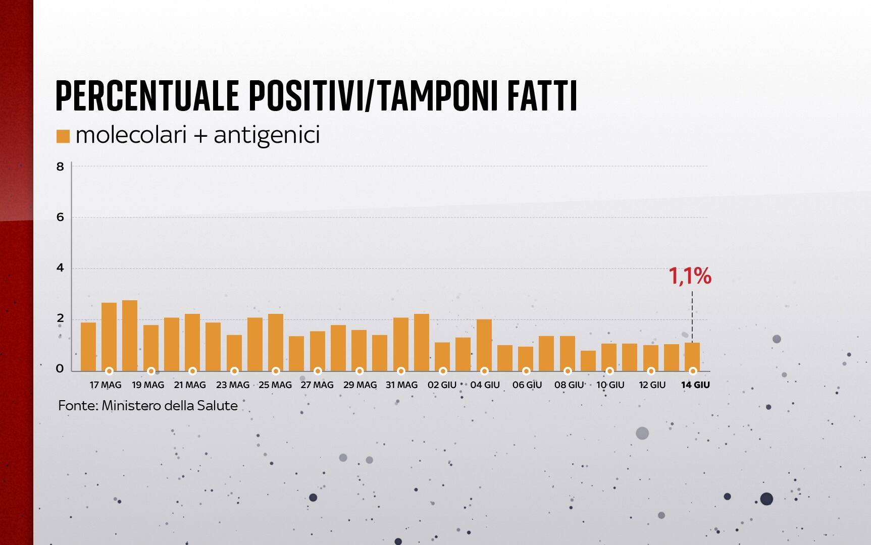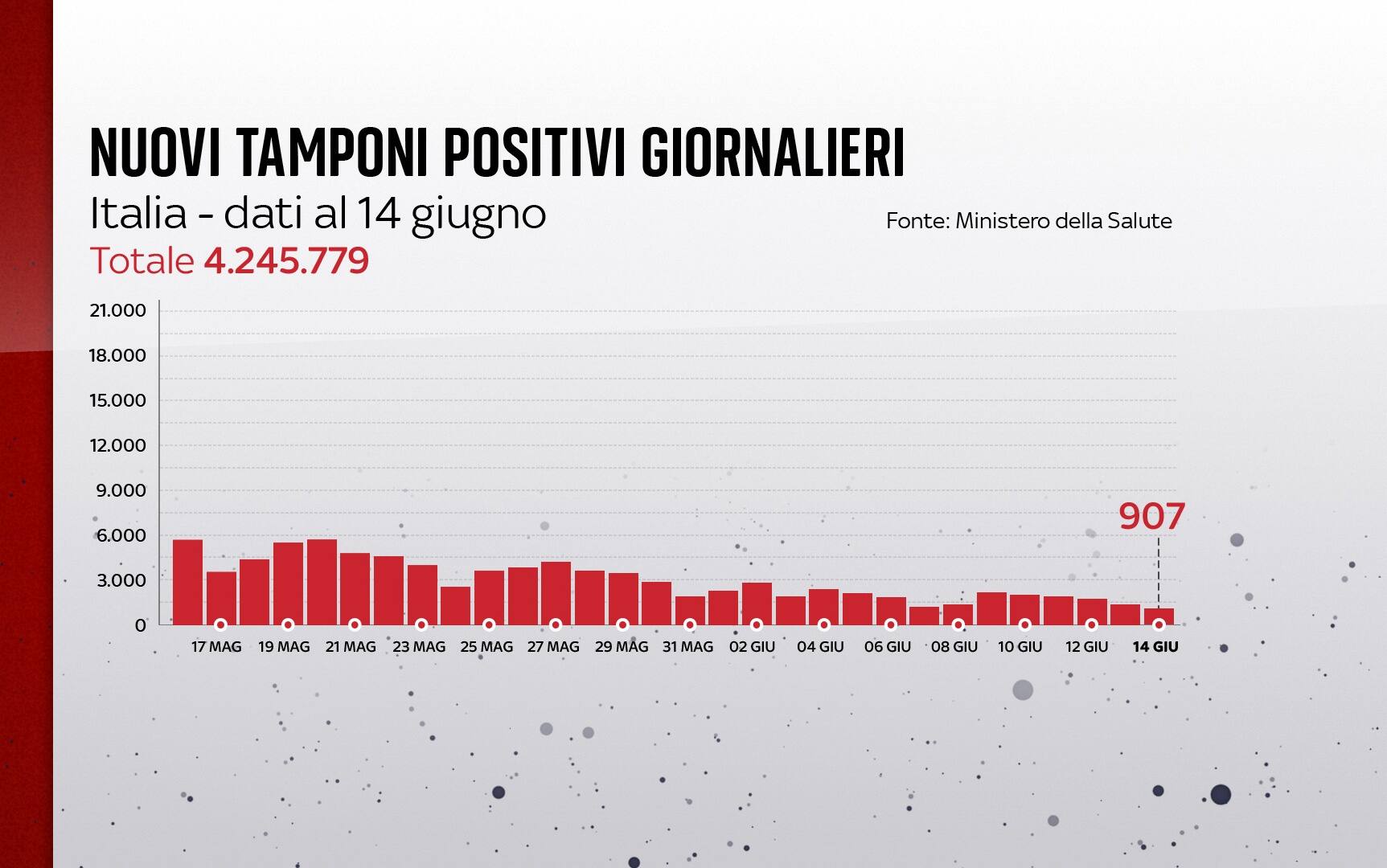 Sono 907 i nuovi contagi di Covid-19 in Italia (ieri 1.390), a fronte di 79.524 tamponi giornalieri effettuati (ieri 134.136). La percentuale di positivi considerando il totale dei tamponi è all'1,1% (ieri 1%). Sono 36 le vittime registrate in 24 ore. Le terapie intensive sono 536 (-29), con 11 nuovi ingressi nelle ultime 24 ore. È questo il quadro che emerge dal bollettino del ministero della Salute del 14 giugno sulla situazione coronavirus in Italia (AGGIORNAMENTI LIVE - SPECIALE - LA SITUAZIONE IN ITALIA CON MAPPE E INFOGRAFICHE - DATI E GRAFICI SUI VACCINI).