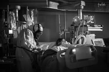 "Da settembre 2020 fino alla chiusura della nostra terapia intensiva covid, avvenuta a fine maggio 2021 ho archiviato circa 200 scatti inerenti l’emergenza sanitaria. Durante la seconda ondata ben presto ci siamo ritrovati con tutti i posti letto occupati. Il carico di lavoro era estenuante e a tratti umanamente impossibile da sopportare. Dentro le tute si sudava parecchio e spesso le visiere si appannavano. Non potevamo bere o andare in bagno"