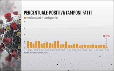 Scende ancora la percentuale dei positivi sui tamponi giornalieri effettuati: il dato è allo 0,5%, il più basso del 2021 (0,7% il giorno precedente)