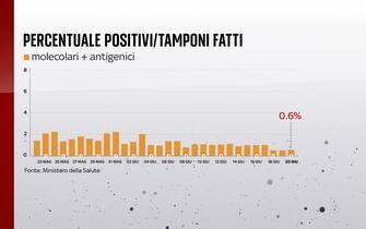 La percentuale di positivi considerando il totale dei tamponi è allo 0,6% (ieri 0,5%)
