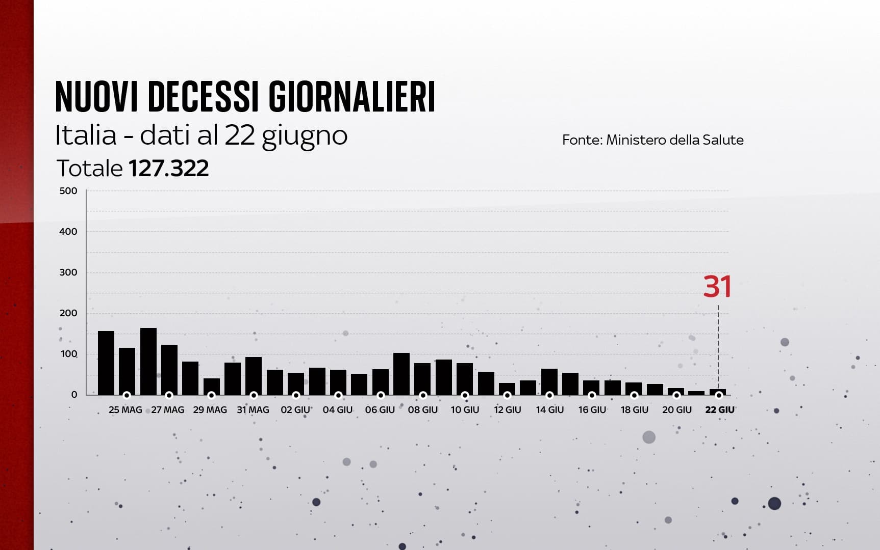 In Italia, dall'inizio della pandemia, le persone risultate positive al coronavirus, compresi guariti e deceduti, sono 4.254.294. Le vittime in totale sono 127.322, con 31 decessi nelle ultime 24 ore. I guariti sono un totale di 4.054.008. I ricoverati con sintomi sono 2.289 (-101). Sono invece 70.313 le persone in isolamento domiciliare. I tamponi sono in tutto 70.190.855 - di cui 51.242.092 processati con test molecolare e 18.948.763 con test antigenico rapido -, in aumento di 192.882 rispetto al 21 giugno. Le persone testate sono finora 29.210.013, al netto di quanti tamponi abbiano fatto.