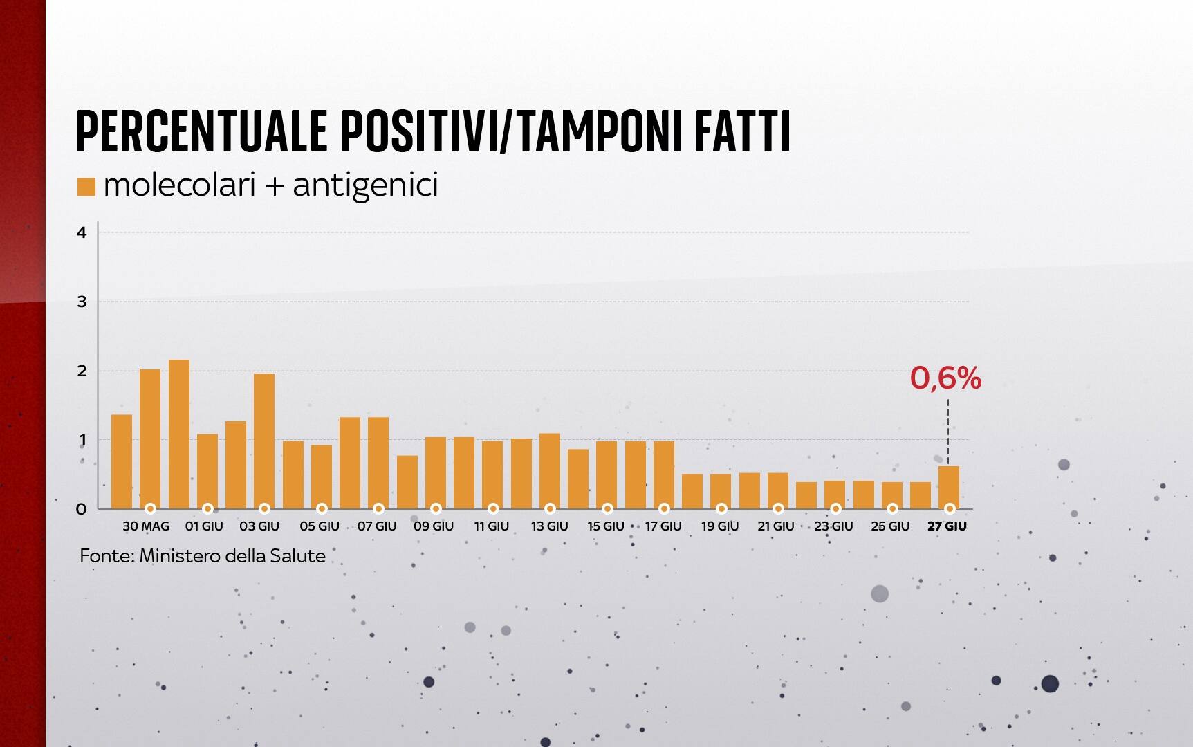 Sono 782 i nuovi contagi di Covid-19 in Italia (ieri 838), a fronte di 138.391 tamponi giornalieri effettuati (ieri 224.493). La percentuale di positivi considerando il totale dei tamponi è allo 0,6% (ieri 0,4%). Sono 14 le vittime registrate in un giorno. Le terapie intensive sono 294 (-4), con 10 nuovi ingressi nelle ultime 24 ore. È questo il quadro che emerge dal bollettino del ministero della Salute del 27 giugno sulla situazione coronavirus in Italia (AGGIORNAMENTI LIVE - SPECIALE - LA SITUAZIONE IN ITALIA CON MAPPE E INFOGRAFICHE - DATI E GRAFICI SUI VACCINI).