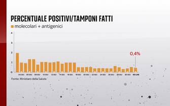 Considerando il totale dei tamponi, la percentuali di positivi è allo 0,4% (ieri era all'0,5)