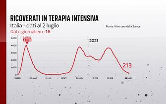 Continua a calare la pressione dei pazienti positivi sugli ospedali. Secondo il bollettino del 2 luglio, i ricoverati nei reparti ordinari sono 63 in meno di ieri. In terapia intensiva ci sono 213 persone (-16). In Italia nelle ultime 24 ore sono stati 794 i nuovi casi di coronavirus, su 199.238 tamponi (ieri 882 casi su 188.474 test). Il tasso di positività è allo 0,4% (era 0,5). Dall'inizio della pandemia, i contagiati sono 4.261.582 e le vittime 127.615 (28 nelle ultime ore)