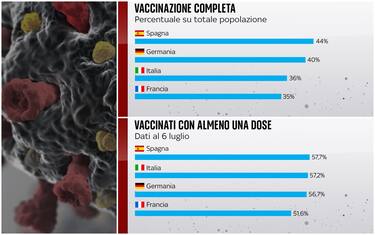 Guardando invece al numero di vaccinati con almeno una dose (al 6 luglio), la Spagna è sempre in testa con il 57,7% della popolazione, seguita dal nostro Paese (57,2%), dalla Germania (56,7%) e dalla Francia 51,6%
