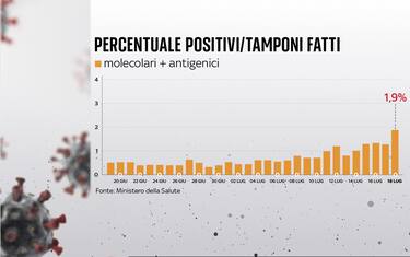 Come detto, la percentuale di positivi - considerando il totale dei tamponi - è in salita: è all'1,9%, mentre ieri era all'1,3% (+0,6%)