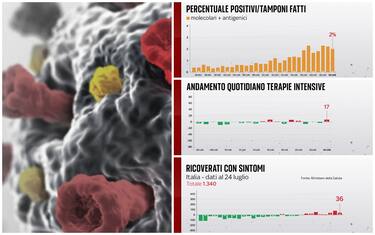 Secondo il bollettino del 24 luglio, si registrano 5.140 nuovi casi su 258.929 tamponi giornalieri effettuati. La percentuale dei positivi è in lieve diminuzione rispetto a ieri. Sono 5 i morti nelle ultime 24 ore. Risalgono i pazienti Covid nei reparti di terapia intensiva (+17) e i ricoverati con sintomi nei reparti ordinari (+36)